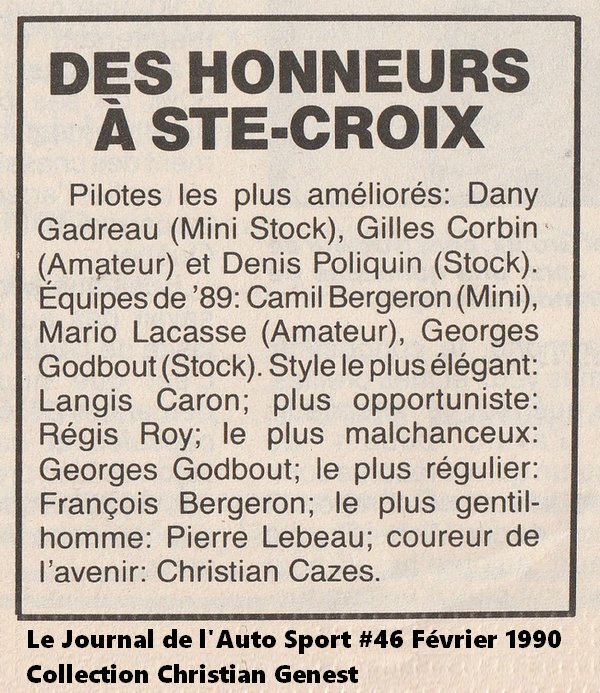 9 août 2025 Photo 2006 (1ère) de Michel Laplante Photo 2022 (2e) de Benoit Landry Photo 2023 (17e) de Matthew Lambert Photo 2022 (2e) de Jean-François Leblanc Liste des trophées (Saison 1989) du Circuit Ste-Croix Article 1990 (95e) du Circuit Ste-Croix Article 1989 (publié février 1990) (65e) du Circuit Ste-Croix Article 1990 (4e) de Marcel Latreille Article 1990 (8e) du Circuit Deux-Montagnes Article, photo 1990 (13e, 14e) de Christian Cazes Photo 1990 (1er) d'Alexandre Tagliani Photo 1990 (6e) de Donald Theetge