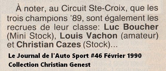 22 août 2025 Photo 2022 (2e) de Steve Raby Article remplacé 1990 (1er) de Robert Ranger Photo 1990 (1ère) de Michel Brunet Photo 1990 (1ère) de Mario Boulay #2 Photo 1990 (7e) de Marcel Latreille Photo 1990 (3e) de Jacques Prévost Photo 1990 (3e) de Daniel Wolfe Publicité 1990 (23e) de l'Autodrome Drummond Articles 1990 (20e, 21e, 22e) de l'Autodrome Drummond Articles 1990 (23e, 24e) de l'Autodrome St-Eustache Publicité 1990 (13e) de l'Autodrome St-Félicien Articles 1990 (37e, 38e) de l'Autodrome Rive-Sud Publicité 1990 (34e) de l'Autodrome Granby