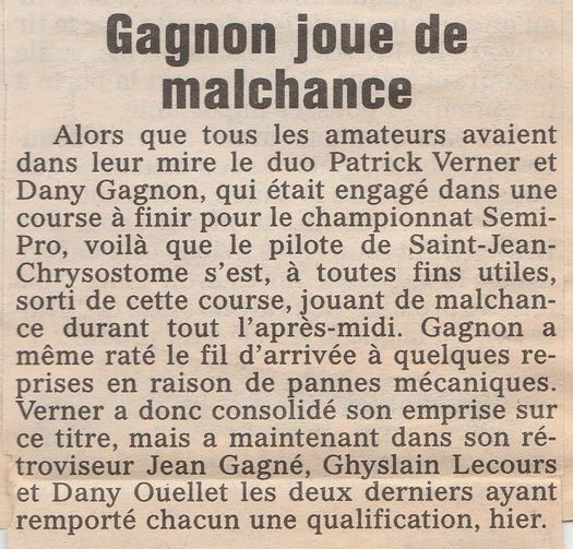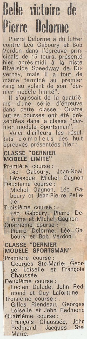 10 janvier 2024 Articles 1971 (2e, 3e) de Georges Loiselle 101 Documents 1977 (6e à 106e) du Rebel Speedway Photo 1988 (1ère) d'Alain Nault Photo 2023 (1ère) de Mikael Leduc-Bouchard Article 1971 (83e) du Quebec Modern Speedway Photo 2023 (1ère) de Loic Perreault-Roy Photo 2019 (9e) de Bryan Cloutier Articles 1971 (14e, 15e) de Marcel Corriveau Photo 2009 (1ère) de Normand Voghell Article 1971 (2e) d'André L'Italien Photo 2004 (3e) de Michel Dusseault Article 1971 (37e) du Riverside Speedway Photo 1994 (1ère) de David Hébert Article 1971 (4e) d'André Fortin Photos (2000 à 2016) de Pierre Raymond #2