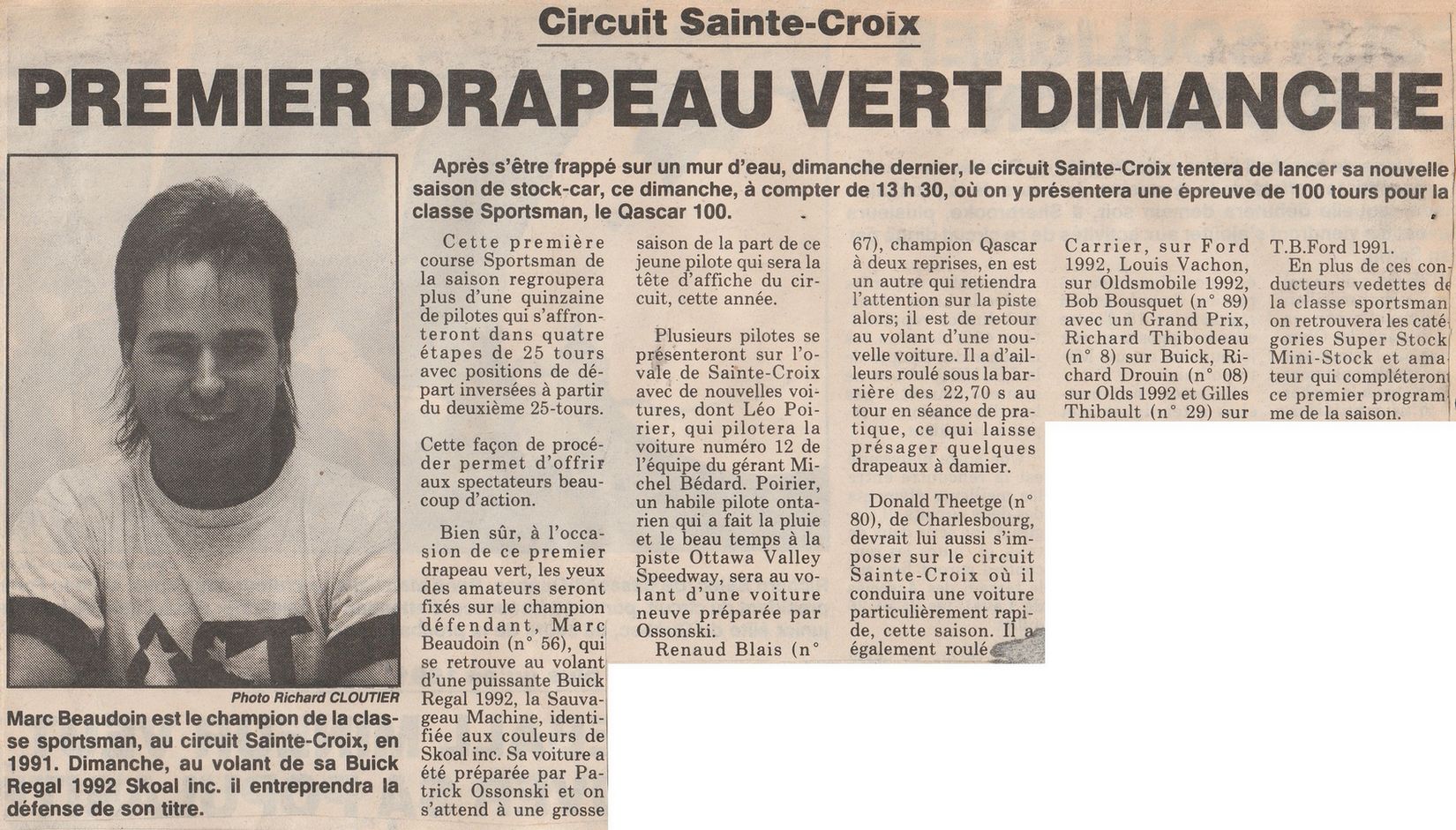 15 janvier 2024 Publicité 1992 (18e) de l'Autodrome St-Félicien Photo 2006 (1ère) de Jason Durgan Article 1992 (2e) de Gilles Perreault Article 1992 (3e) de Sylvain Lacombe Article 1992 (9e) du Sanair Super Speedway Photos 1989 (1ère, 2e) de Kenny Schrader Article 1992 (12e) de l'Autodrome Drummond Article 1992 (3e) d'Yvon Bédard Article 1992 (6e) de Donald Theetge Photo 1996 (3e) de Mario Genest