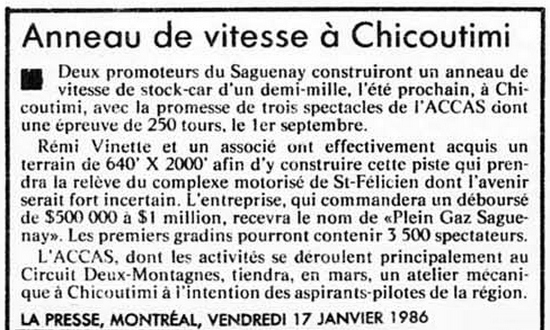 Projet de piste ovale asphaltée de 1/2 mile en 1986.