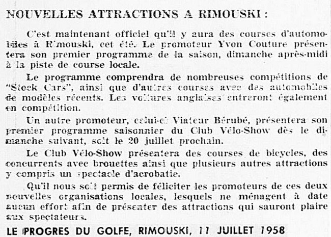 En 1958 et 1959 au moins pour le stock-car : Piste ovale de 1/2 mile en terre-battue